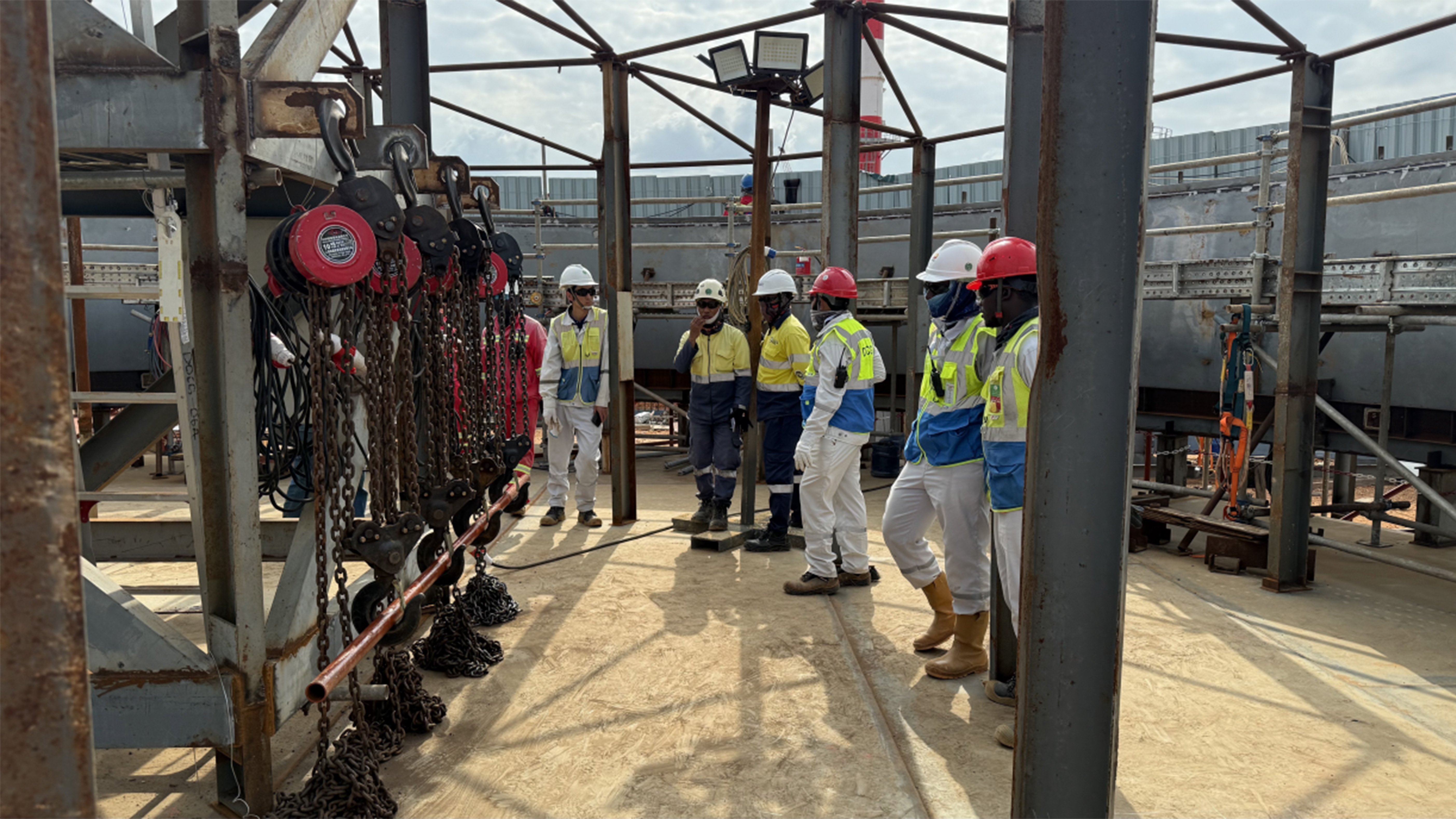 在储罐施工过程中,安全是重中之重,现场材料摆放、临时围栏与警示标识一应俱全。终端储罐采用倒装法进行施工,电动倒链提升系统关系着整个储罐的安装。同时,项目部还非常注重施工现场的环保与工人健康。食堂和宿舍区的卫生条件定期接受检查,确保饮食与居住环境安全。工人们可在专门设置的休息区短暂放松,并随时补给饮用水,以防止高温作业造成的身体不适。